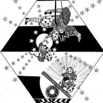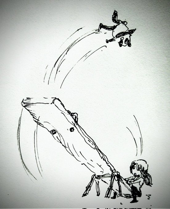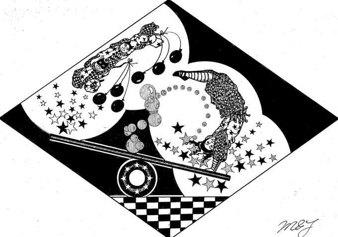 ✋🤚ハイタッチ!✋🤚 🎪🃏😸😺🐶《道化師と陽気な仲間たち》によるアクロバット (エアリアルストラップ /シーソー) #道化師と陽気な仲間たち #アトリエの系譜N #マンガスタイルイラスト #ペン画 #アナログ #モノクローム #アクロバット #エアリアルストラップ #シーソー #ハイタッチ