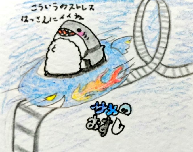 今日はジェットコースターの日です、新しく出来たサメ型コースターに乗りに来たホオジロさんストレスストレス発散にちょうど良い速さだそう #ジェットコースターの日 #ジェットコースター記念日 #ジェットコースター #サメ #サメのおすし #イラスト #手書き #アナログイラスト #アナログ絵 #Shark