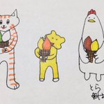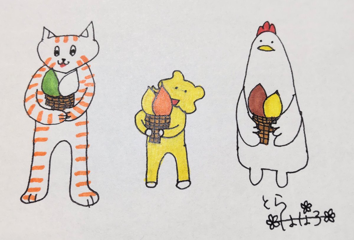 おはようございます!! #ジェラートの日 😺、ピスタチオ、ミルク!! 🐘、オレンジ、りんご!! 🐔、栗、さつま芋!! 今日も素適な土曜日を〜🤗 #絵描きさんと繫がりたい #みんなで楽しむTwitter展覧会 #イラスト #油性ペン #マッキー