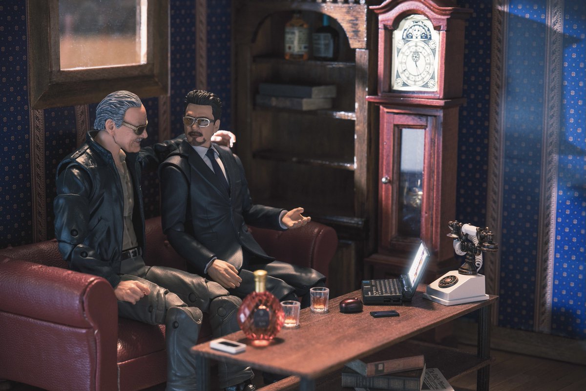 【ミニチュアのミニチュア】 特撮のミニチュアセットのスタジオのジオラマ ここにガチャポンフィギュアなどを並べ、スマホで撮影を楽しめる機能も備えた遊べるジオラマの提案 (ジオラマベースは映画のフィルム缶を使用) #ジオラマ作ってないひとにジオラマ作りたくさせるような写真