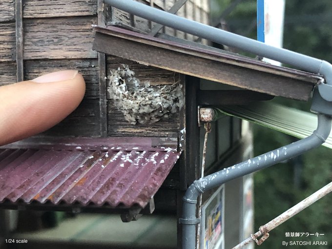 【ツバメの巣】 ツバメの子育ての季節。 街で巣を見かけたら必ず足を止めてみてしまう派。 著書『駄菓子屋の[超リアル]ジオラマ』 駄菓子屋のジオラマを作る本ですが、燕の巣の作り方などマニアックな内容も書いてあります♬ amzn.to/3xgQ4YC #ジオラマ