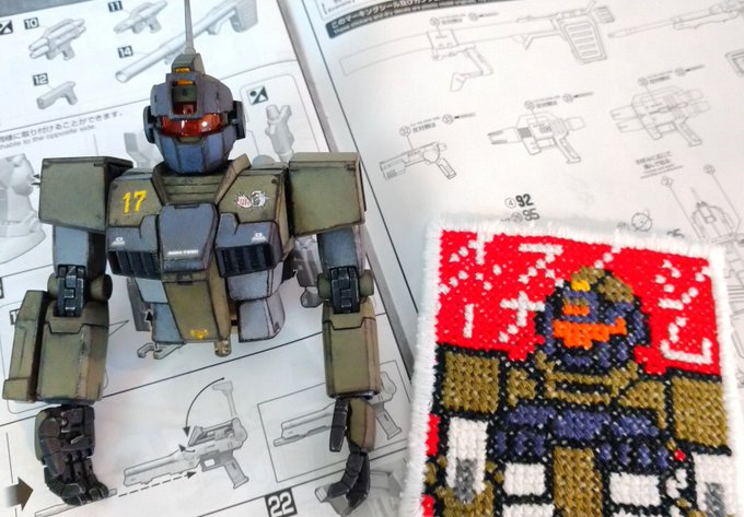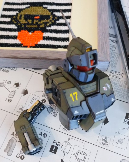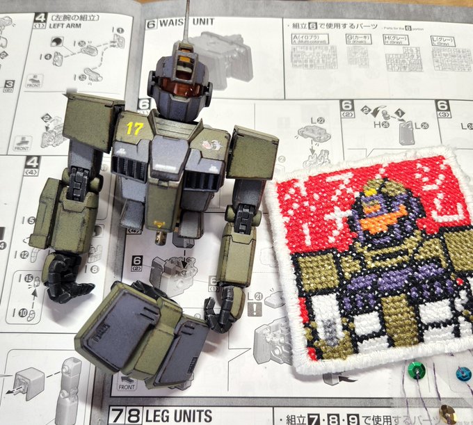 夏休み入って 少し時間が出来たので、腰パーツを少し塗装して組みました😊 #gunpla #GMSNIPERCUSTOM #ジムスナイパーカスタム #ガンプラ #RGM79SC #刺繍 #クロスステッチ
