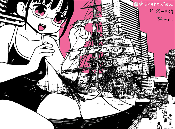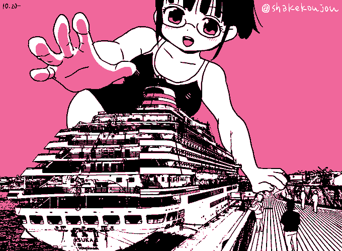 おはようございめゃす。 #起きらくがき (一回間違えて消えちゃったけど悔しいからやっぱり描き直した…) みなとみらいのパシフィコ横浜の側にある、ぷかり桟橋の側にぷかりと浮かぶ巨大化妹です。 #ジャイアントリトルシスター