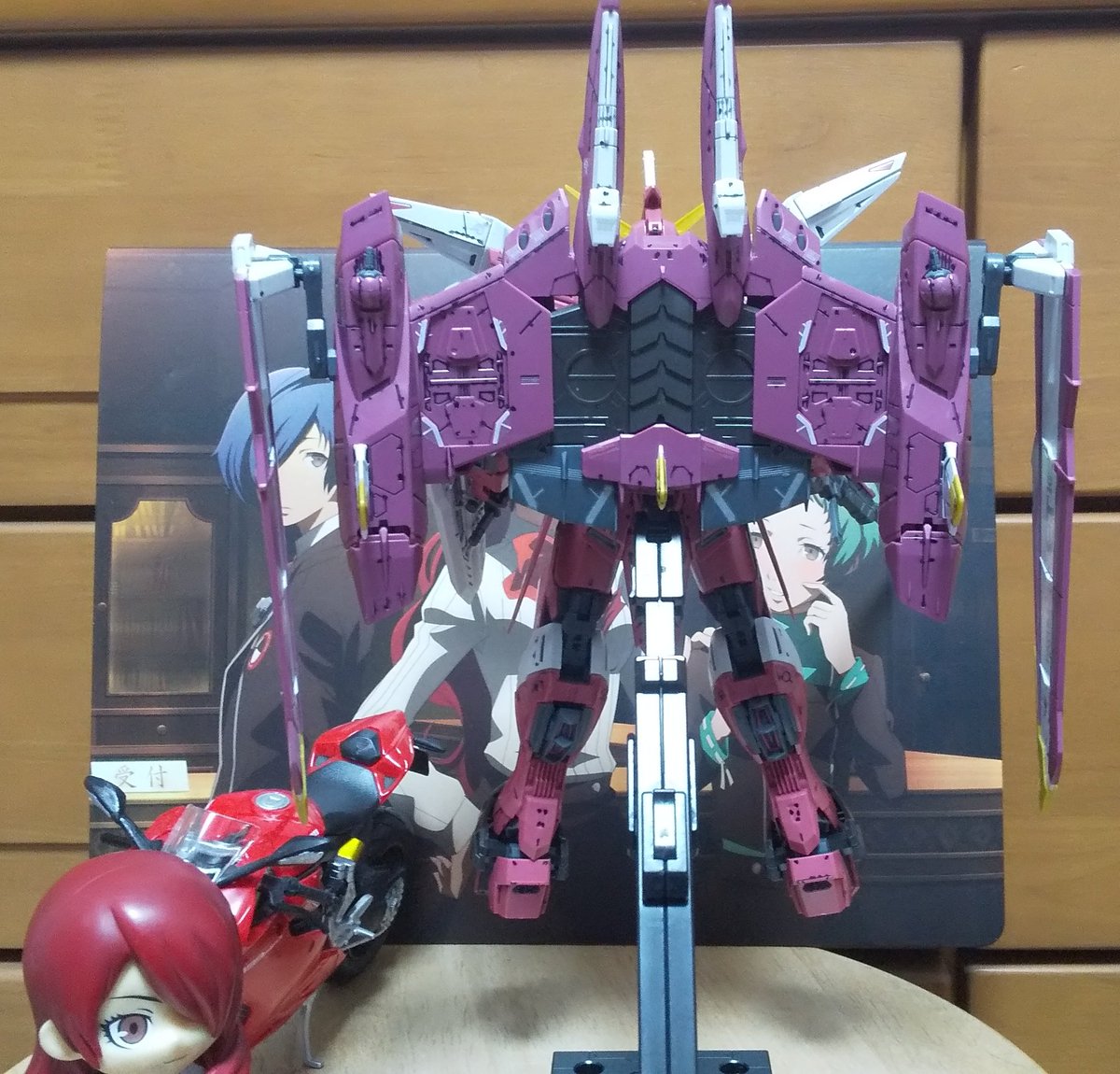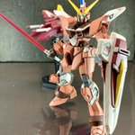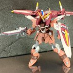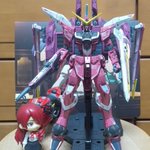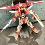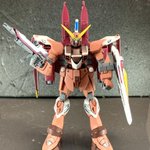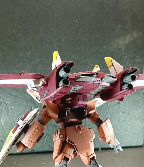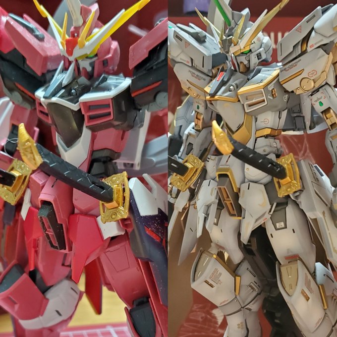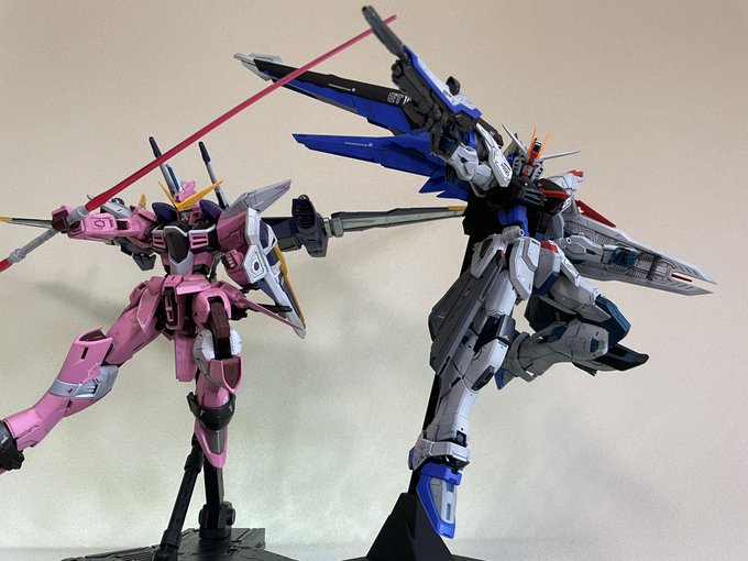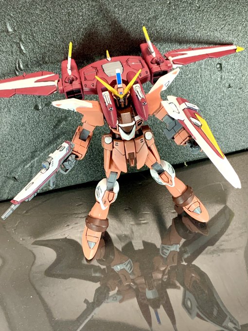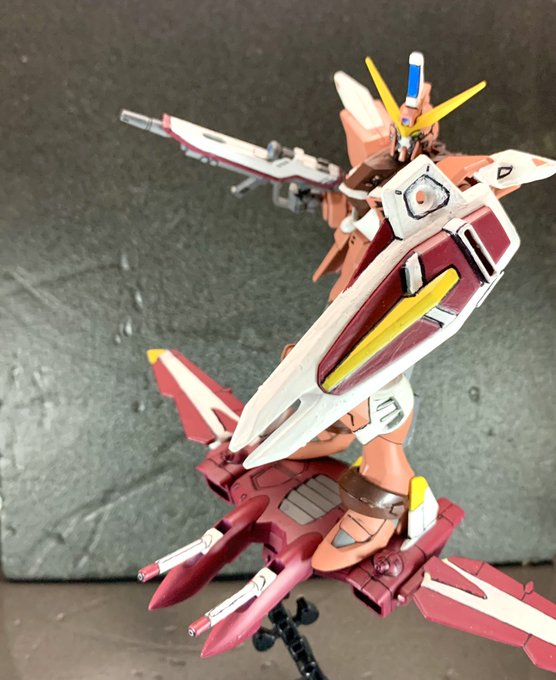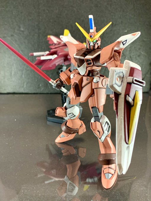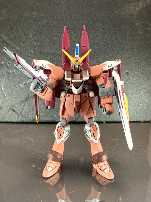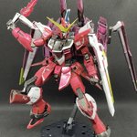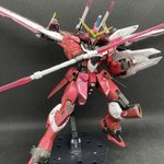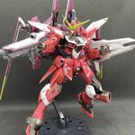 #ガンプラの画像貼るとRTされると聞いて #ジャスティスガンダム #ミーアキャンベル #seed ひさびさの完成。MGのジャスティス。 なんかミーアキャンベル 専用って感じの色になってしまった😂 関節はフリーダムと対のメタリックレッド「蹴散らすぞ!」って場面ができた。