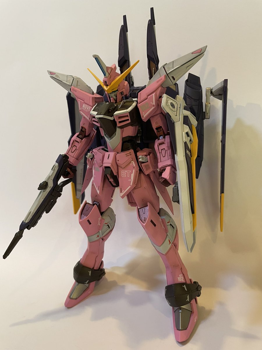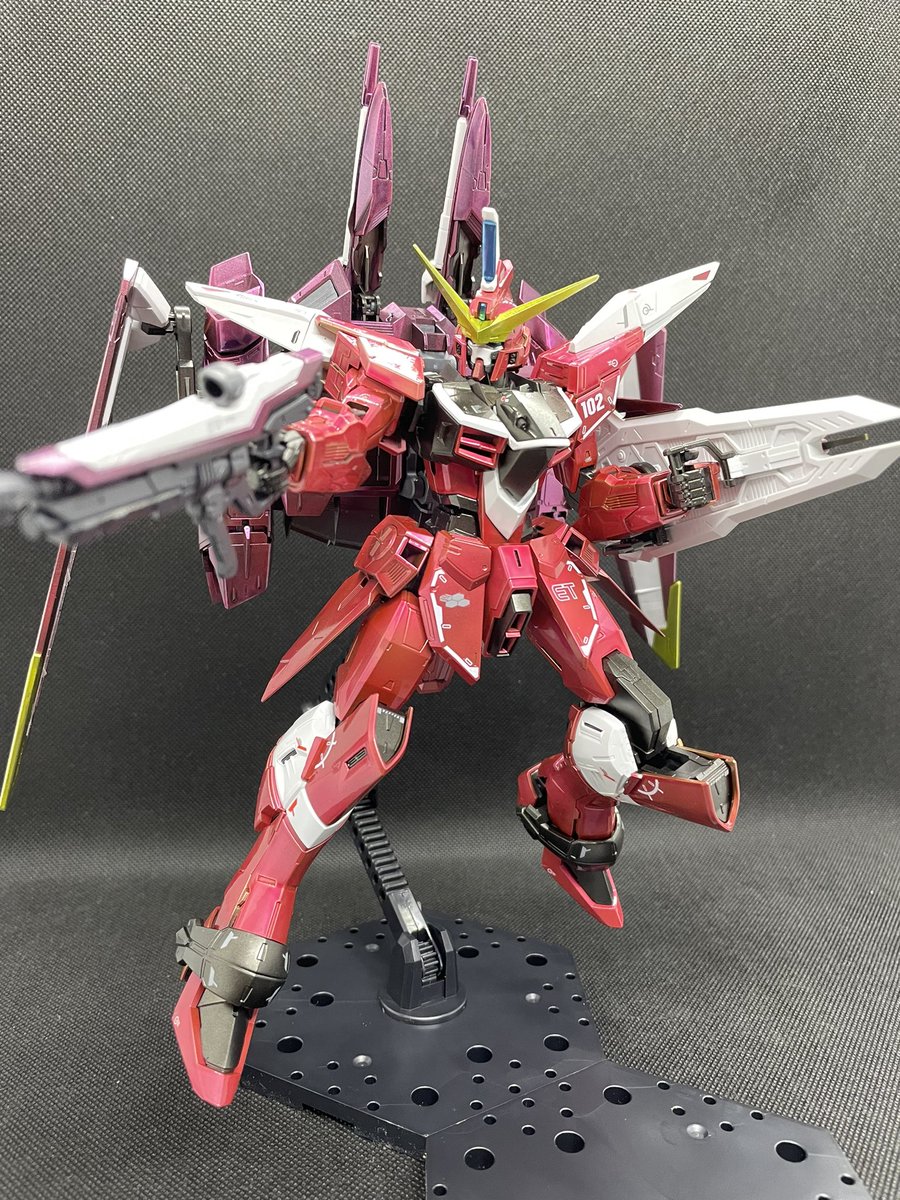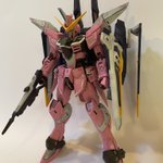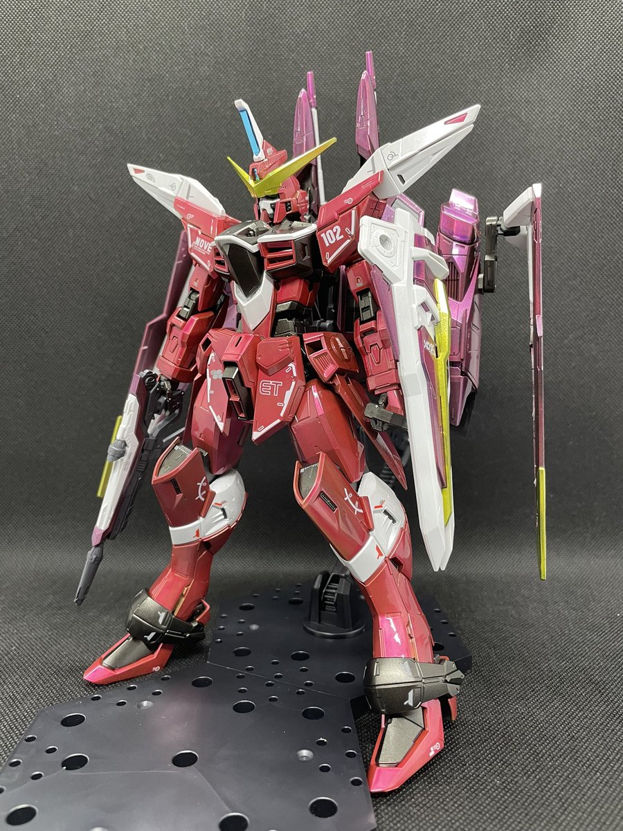 完成!MGジャスティスガンダム! キャンディ&メタリック塗装で仕上げました! もうクリアーピンク使いたくないです… 難しかった… #ガンプラ #ガンプラの画像を貼るとRTされると聞いて #ジャスティスガンダム