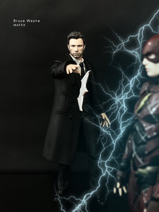 mafexブルースウェインで フラッシュをスカウトしに行ってバットラングを投げだところを再現📸 当然バリーアレン姿のフィギュアはないのでフラッシュコスチュームで代用。 バットラングがないと、ただのコート着たおじさまフィギュアなんだよなあ… #オモ写 #バットマン #ジャスティスリーグ