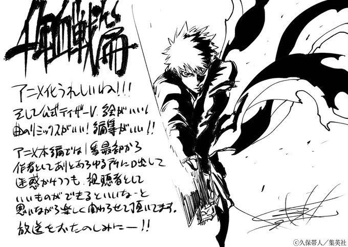 #ジャンプフェスタ 2022 スーパーステージEX内で公開された、TVアニメ『BLEACH 千年血戦篇』ティザーPV &ビジュアルの解禁を記念して、久保帯人先生よりコメントが到着しました!〈スタッフ〉 #BLEACH #BLEACH_anime
