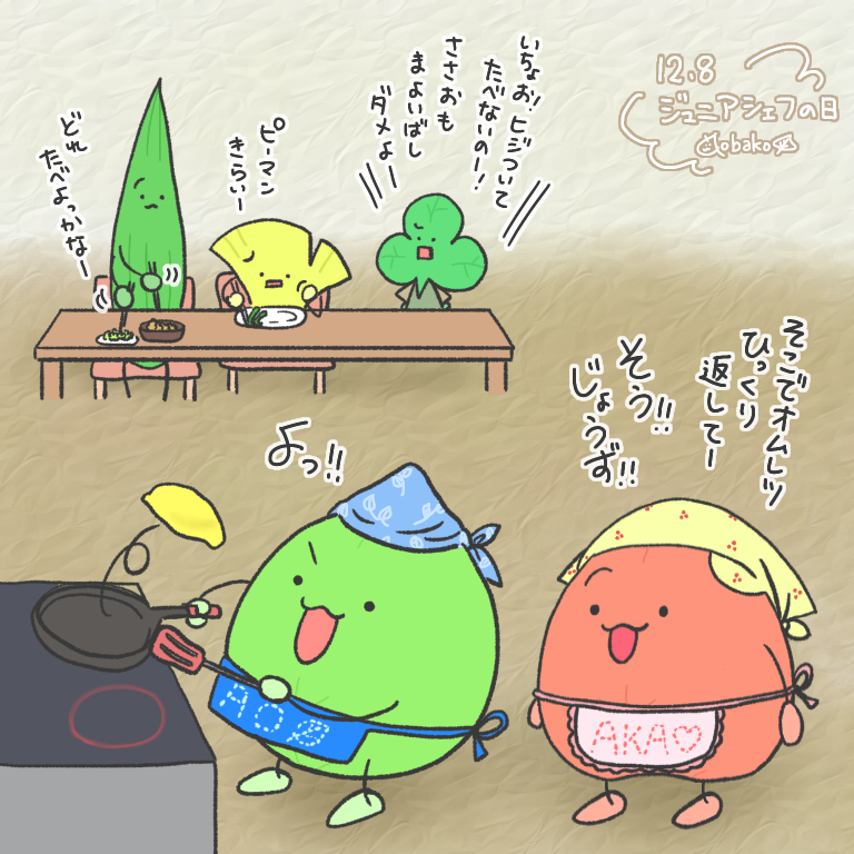 おはばコ~☀️ 今日は「#ジュニアシェフの日」 だよ👨🍳 あかばコにお料理を教えてもらったんだ(∩*˘∀˘*)∩🍳🔥 美味しいオムレツが出来たよ~🐣 #ちゃんとフライパンでうけとめたよ #ご飯のお作法も覚えないとね #今日は何の日 #12月8日 #一日一絵 #あおばコ #ゆるい絵 #アトリエの系譜3 #1コマ漫画