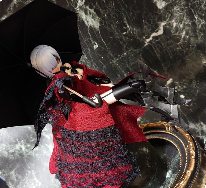 ハロウィンコンペ用の初ガール作品、完成度8割といったところです。 ゴシックってハロウィンと関係ありますよね…? 傘はもうちょい飾りつけます。 #ジョーシン郡山店コトブキヤコンテスト #メガミデバイス #ハロウィン