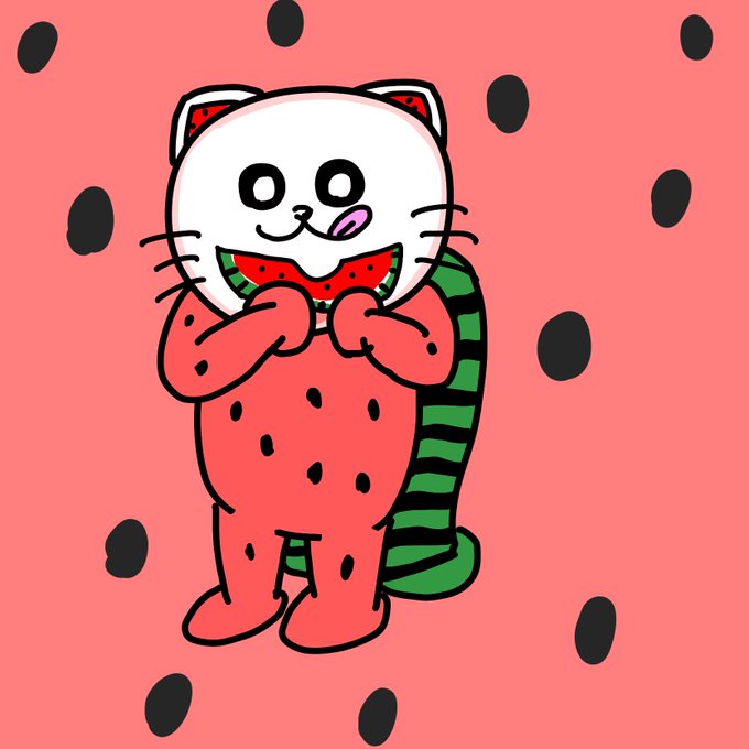 スイカにゃんこちゃん🍉夏の味わい。美味しそうなスイカ描けました💕塗って分かったのですが、スイカって真っ赤とばかり思ってたのですが、赤よりはオレンジ色に近いのですね🤗災害級の猛暑が続きます。暑気払い、熱中症予防にもがぶりと頂きましょう #イラスト #絵描きさんと繋がりたい #スイカ