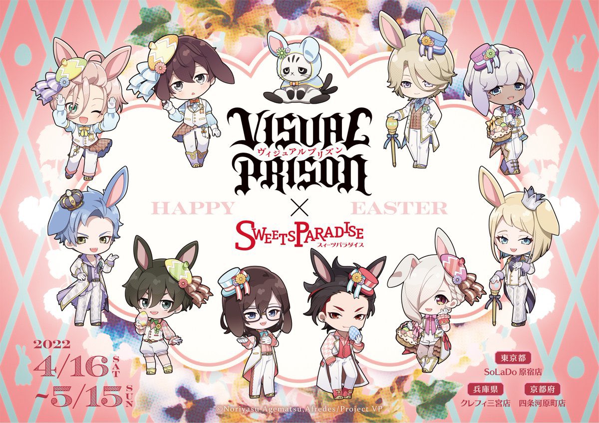 【宣伝】 『ヴィジュアルプリズン』×スイーツパラダイスのコラボカフェSDイラストを描かせて頂きました🌼 何卒よろしくおねがいします🐰❣️ #ヴィジュプリ #スイパラ twitter.com/sp_collabo/sta…