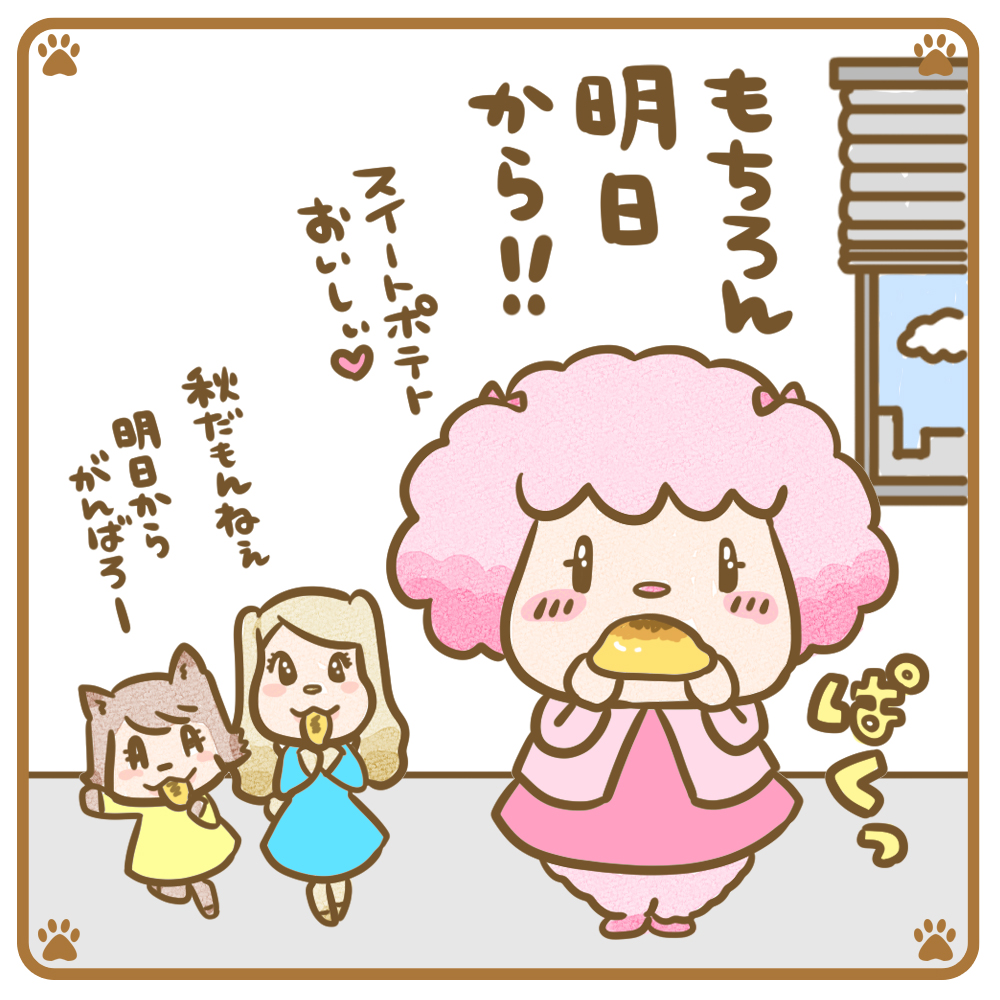 明日できることは明日やる❣ だって、ここに美味しいものがあるんだもん❣❣ #OL #食欲の秋 #ダイエット ❓ #スイートポテト #恋活 #片思い #好きな人を振り向かせる #かわいいもの好き #ゆるふわ #漫画が読めるハッシュタグ #イラスト #イラスト好きな人と繋がりたい #絵描きさんと繋がりたい