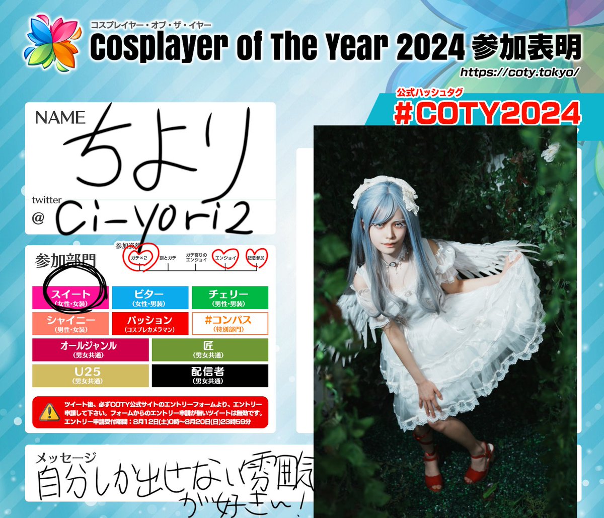 自信はないけど記念受験的に初めてCOTY2024にエントリーします~✊🏻 ̖́- コスプレ始めて沢山の人と関わっていく中で、何か一つ大きい思い出残したいなって思ったので…🫧 いいね&RT数が審査に大きく関わるので皆様どうか拡散ご協力よろしくお願いします🧸🤎 #COTY2024 #スイート部門 twitter.com/i/web/status/1…
