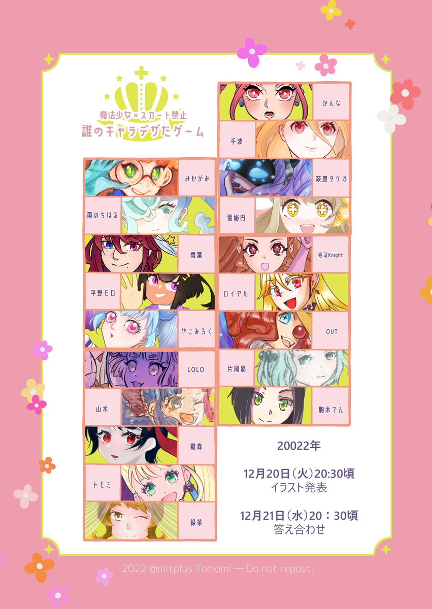 【✨魔法少女×スカート禁止誰デザ✨】 2022/12/20(火)20:30頃~開催いたします。 当日は #スカート禁止誰デザ タグを使用してイラストをTLに約5分おきに載せていきますので、お邪魔に思われる方は適宜ミュート等お願いいたします。 主催の個人的な事情で開催を延期して申し訳ありませんでした。