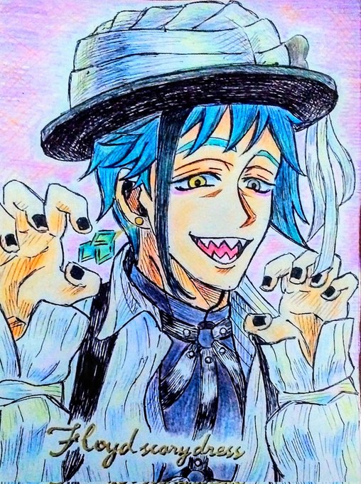 フロイドのスケアリードレスverを 色鉛筆で描きました ! (*-`ω´-)9 #イラストすきな人と繋がりたい #ツイステ #ツイステファンアート #色鉛筆イラスト #フロイド・リーチ #スケアリーモンスターズ #ハロウィン #colorpencil #illustration #halloween #floydleech #twstファンアート