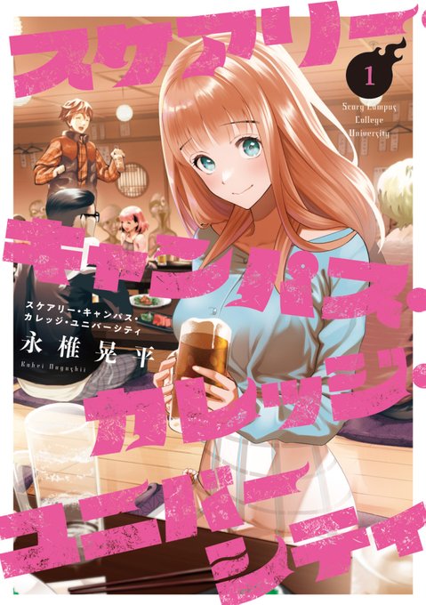 そして、「スケアリー・キャンパス・カレッジ・ユニバーシティ」単行本第一巻の書影も発表されました! ピンクが可愛い楽しい飲み会風景が目印です! 11月4日発売です! 第一巻発売に合わせて、ヤンマガwebでの無料話も拡大されてますので、この機会に是非! magazine.yanmaga.jp/c/SCCU/ #スケキャン