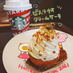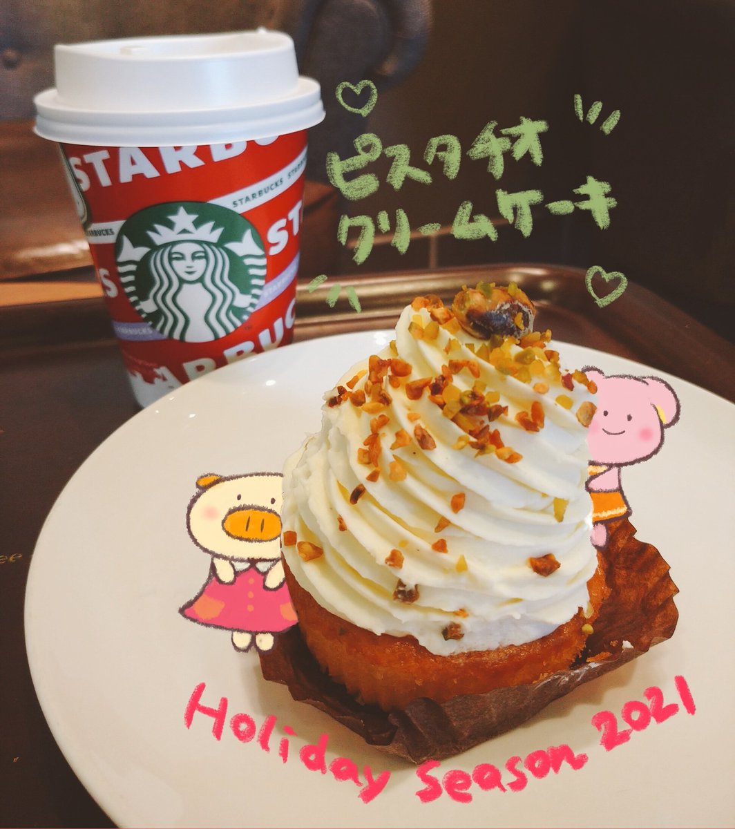 この間いただいたスタバのチケットでホリデーシーズンのピスタチオクリームケーキを食べました🍰💓 とってもとってもおいしかった! #STARBUCKS #スターバックス #スタバホリデー #ピスタチオクリームケーキ #イラスト #絵