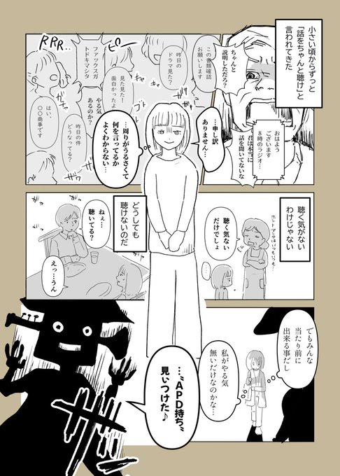 雑音の中で人の話を上手に聴けない #APD 持ちが、音の世界で自分にしか出来ない仕事を見つける話 「聴いているのに聴いていないと言われる」 この障害の存在が多くの人に知られ、当事者の居場所が増えますように。 #スタンバイで仕事が見つかった #コルクラボマンガ専科 #漫画が読めるハッシュタグ