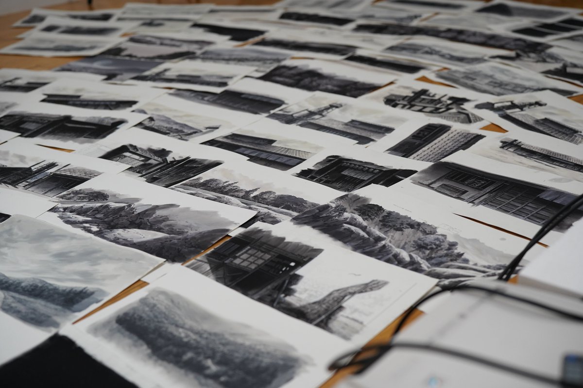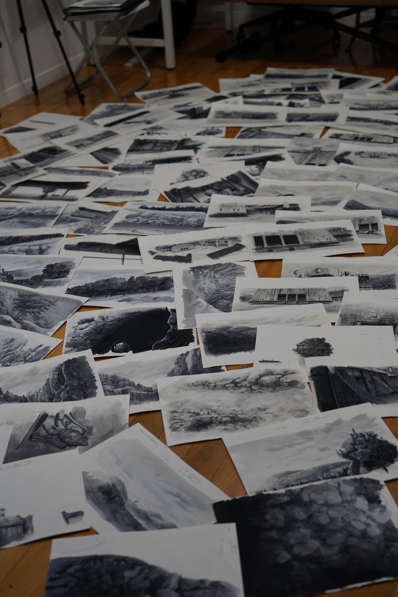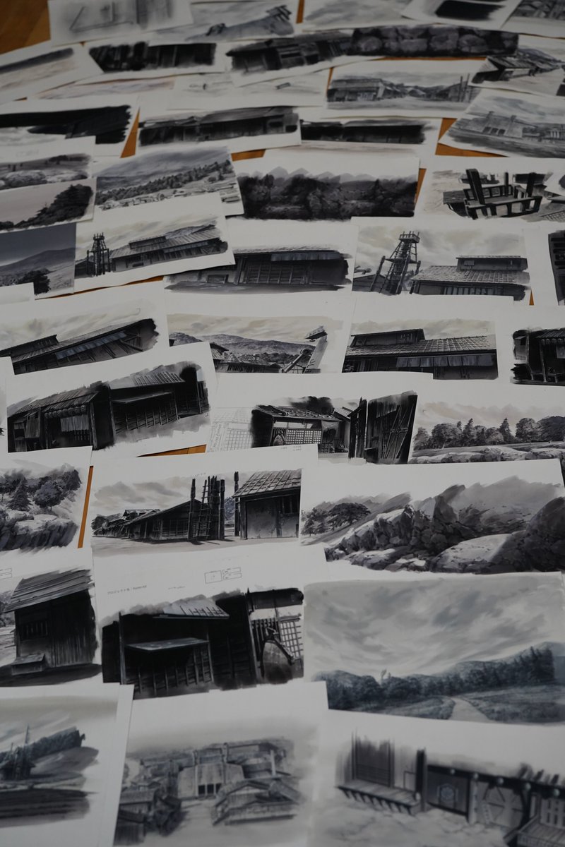 #スターウォーズビジョンズ 神風動画さんのスターウォーズビジョンズ TheDUELより生背景です。黒沢映画的な白黒画面の背景です。最終的にモノクロになりますが描いているときは青系黒と赤系の黒を使い分けてます。神風動画さんの用意してくれた原図が秀逸で写真の絵に原図の線画を被せてます!