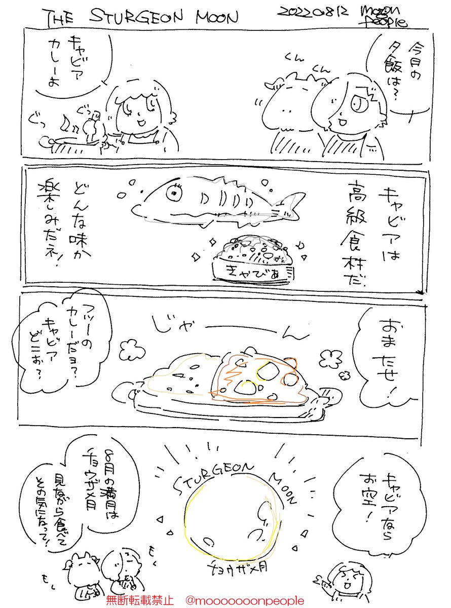 2022.08.12 THE STURGEON MOON「チョウザメ月」 チョウザメ月を見てキャビアを食べた気になろう! 8月の満月は #スタージェンムーン チョウザメの豊漁を願ってその名がつけられたとかなんとか。 #4コマ漫画 #創作漫画 #オリキャラ #コメディ #漫画が読めるハッシュタグ