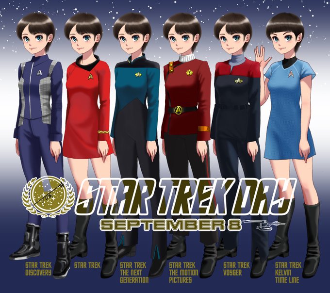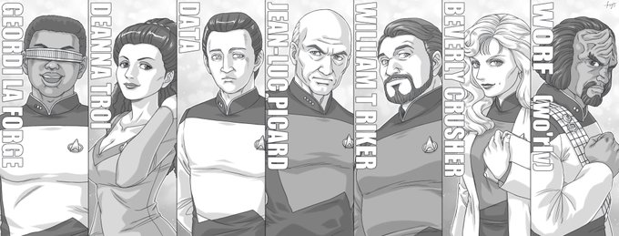 最初からこれがやりたかった…ずらっと並んだ海外ドラマっぽいやつ!(クリック推奨) なんか仕事人くせぇww😇 pixivにもアップしました。そちらでは各メンバーのイラストもまとめてご覧いただけます🖖 長寿と繁栄を!(バルカンいないけど) #イラスト #スタートレック #StarTrekTNG