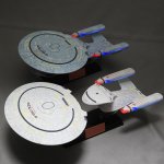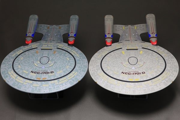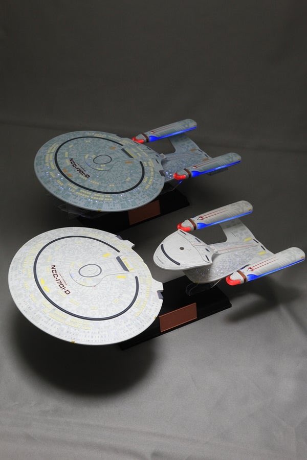 #夜のフィギュア撮影会 5/13 お題 『深』 深宇宙探査船 として活躍し、 銀河の白鳥とも呼ばれる、エンタープライズD TV版と映画版2種揃えてます。 マグネット仕様で船体が分離可能です😊 #スタートレック [既出]