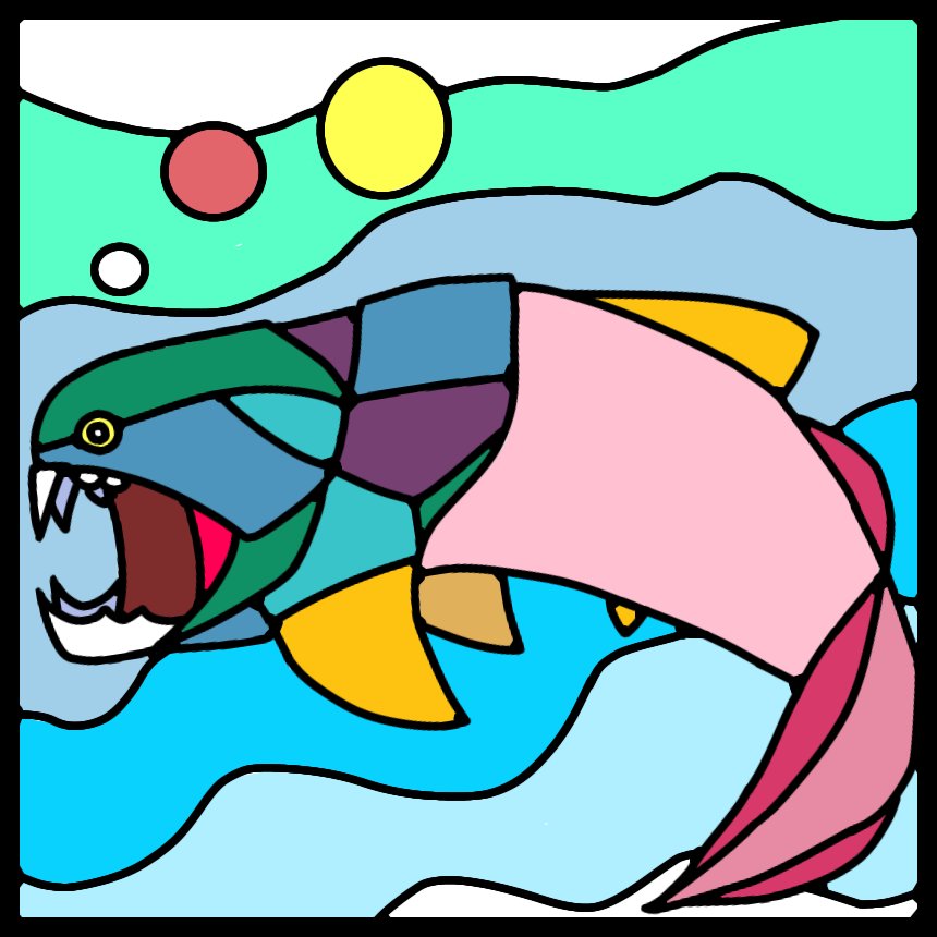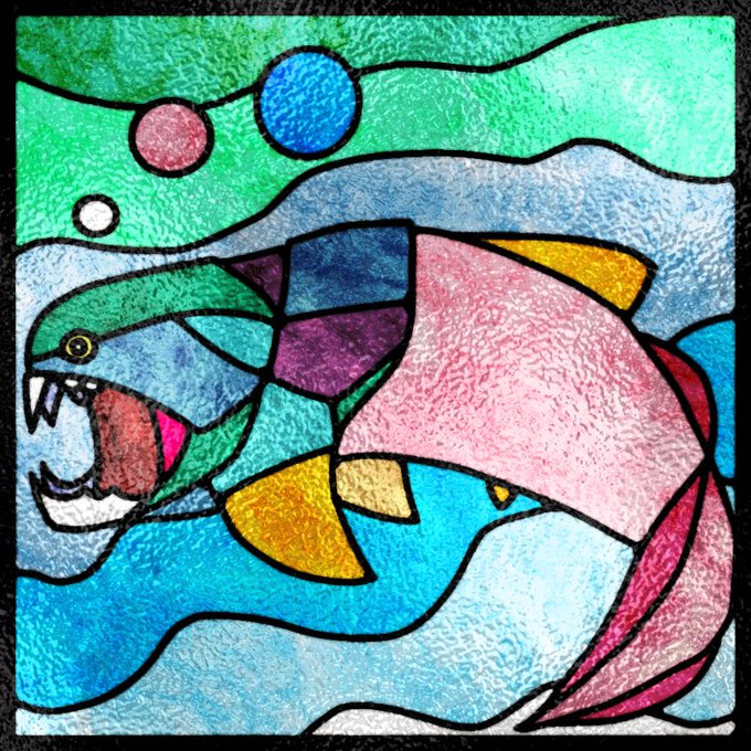 昨日きんじょのイオンで #ダンクルオステウス のフィギュア見つけましたので描いてみました。口の奥の噛む力は5300N程で、それはホホジロザメをこえます。下顎をさげるとかんたんに口が大きくひらくつくり。 #板皮類 #甲冑魚 #古生物 #イラスト #ibispaint #ステンドグラス風