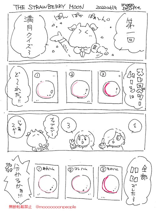 2022.06.14 THE STRAWBERRY MOON「ストロベリームーン」 6月の満月は #ストロベリームーン イチゴが採れる時期ってのが由来。そしてその色合いからハムにそっくりだとかなんとか。 #4コマ漫画 #創作漫画 #オリキャラ #コメディ #漫画が読めるハッシュタグ