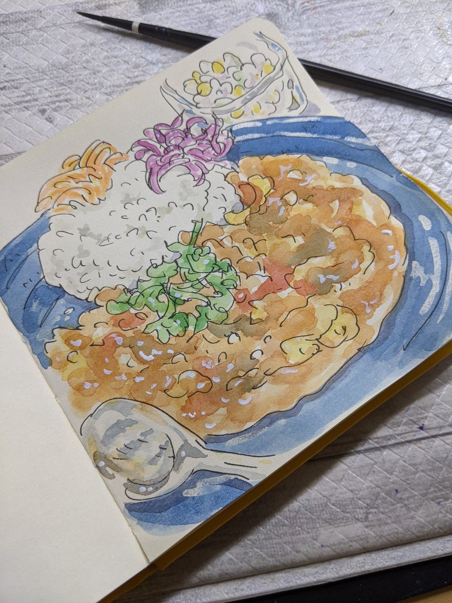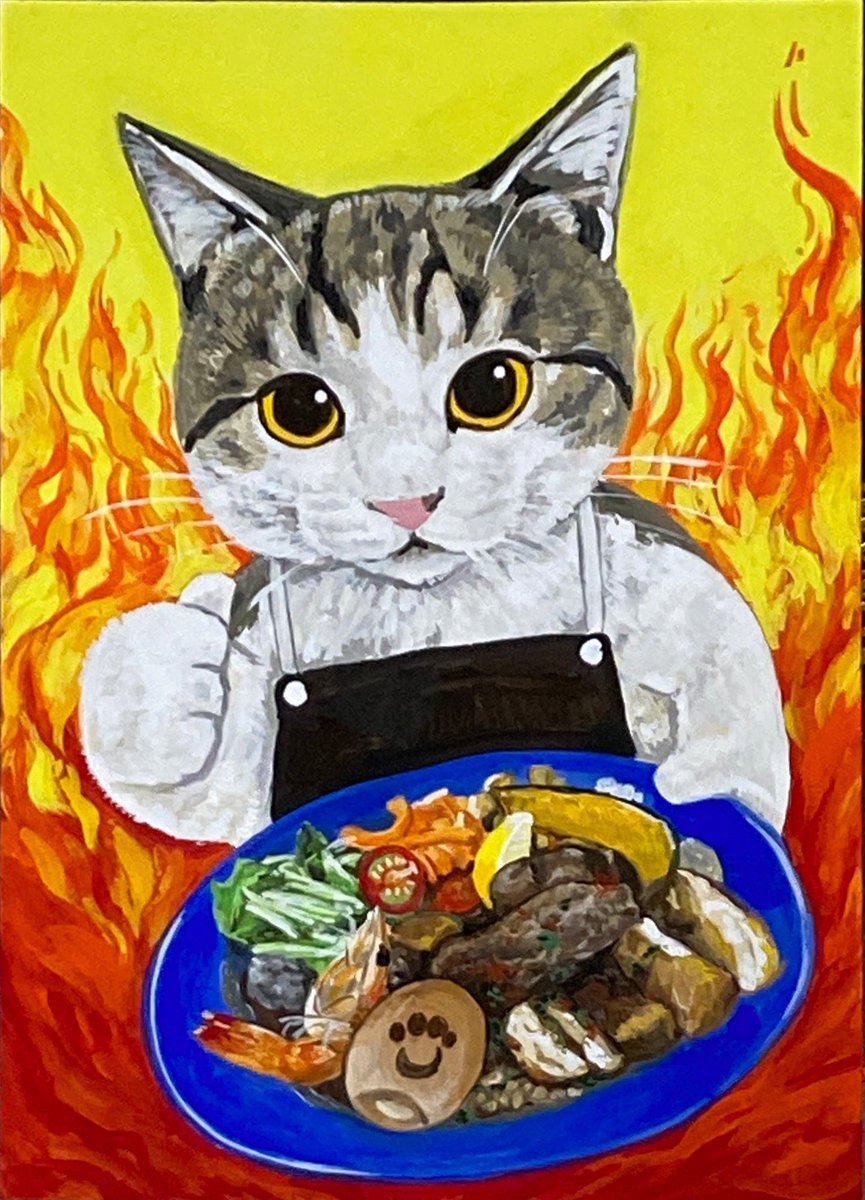 炎のスパイスカレーニャンコ🍛 アクリルガッシュ A4ケント紙 スパイスカレーで元気出すニャ〜💕💕 フォロワーさんのニャンコさん描かせいただきました💕💕 #スパイスカレー #spicecurry