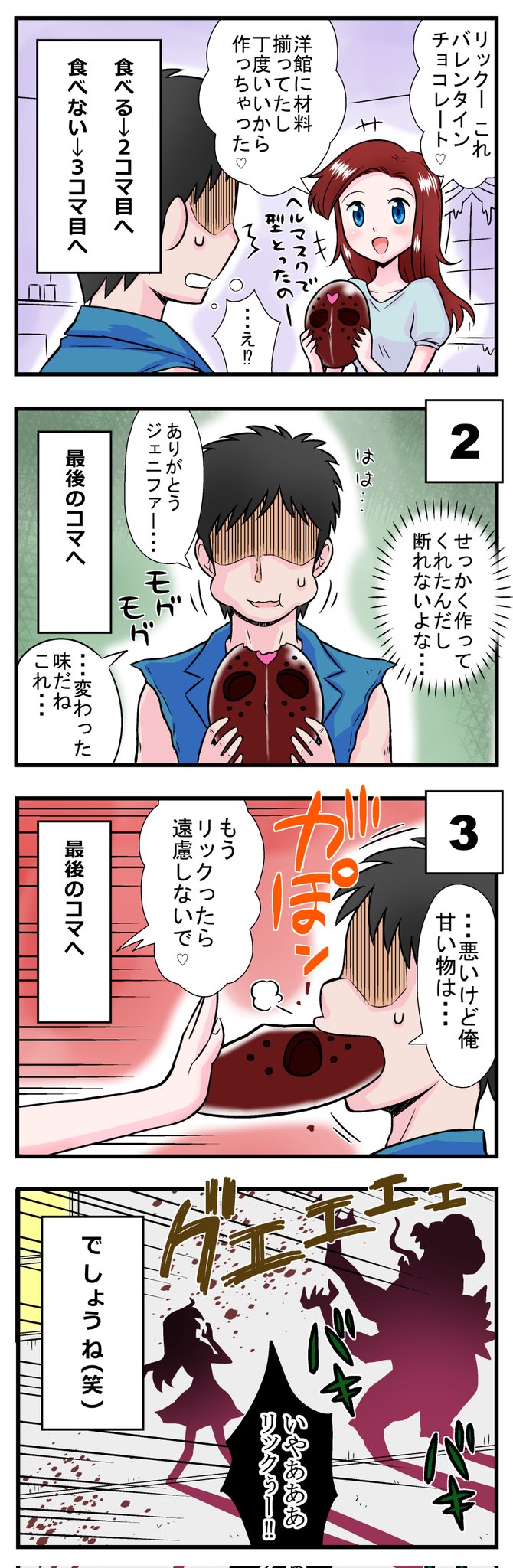 皆さま、こんにちは~☺🎵 去年のバレンタイン4コマ漫画です🌟宜しければどうぞ~✨✨✨ #バレンタイン #バレンタインイラスト #イラスト #四コマ漫画 #漫画が読めるハッシュタグ #ゲーム #スプラッターハウス #チョコレート