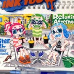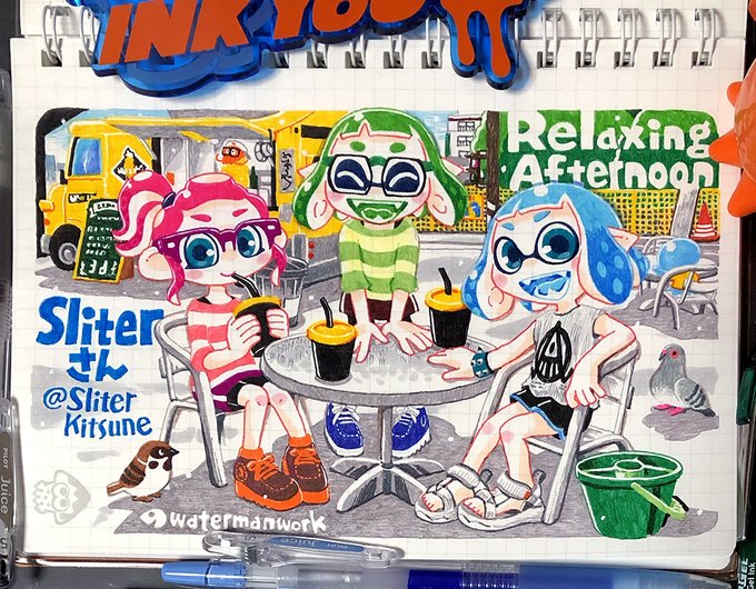 よその子描きます企画・29ページ目! Sliterさん(@SliterKitsune)のイカちゃんとジモンちゃんズ、ロブさんのドリンクを飲みながら広場でのガールズトーク!ってな感じです。 スズメもハトも気になって寄ってきちゃうよね。 #スプラトゥーン2 #ジモンちゃんズ〜よその子描きます