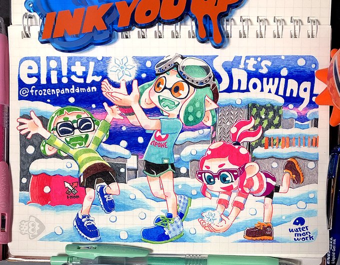 実はまだやってました、よその子描きます企画・31ページ目!これで本当に最後です。 eli!さん(@frozenpandaman)のイカちゃんとジモンちゃんズ、積もった雪に大はしゃぎの3人です。 雪に埋もれたのはどのステージか、わかります? #スプラトゥーン2 #ジモンちゃんズ〜よその子描きます