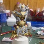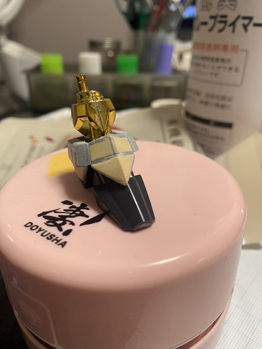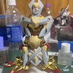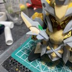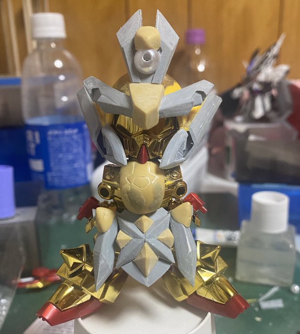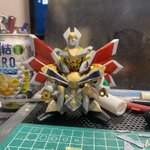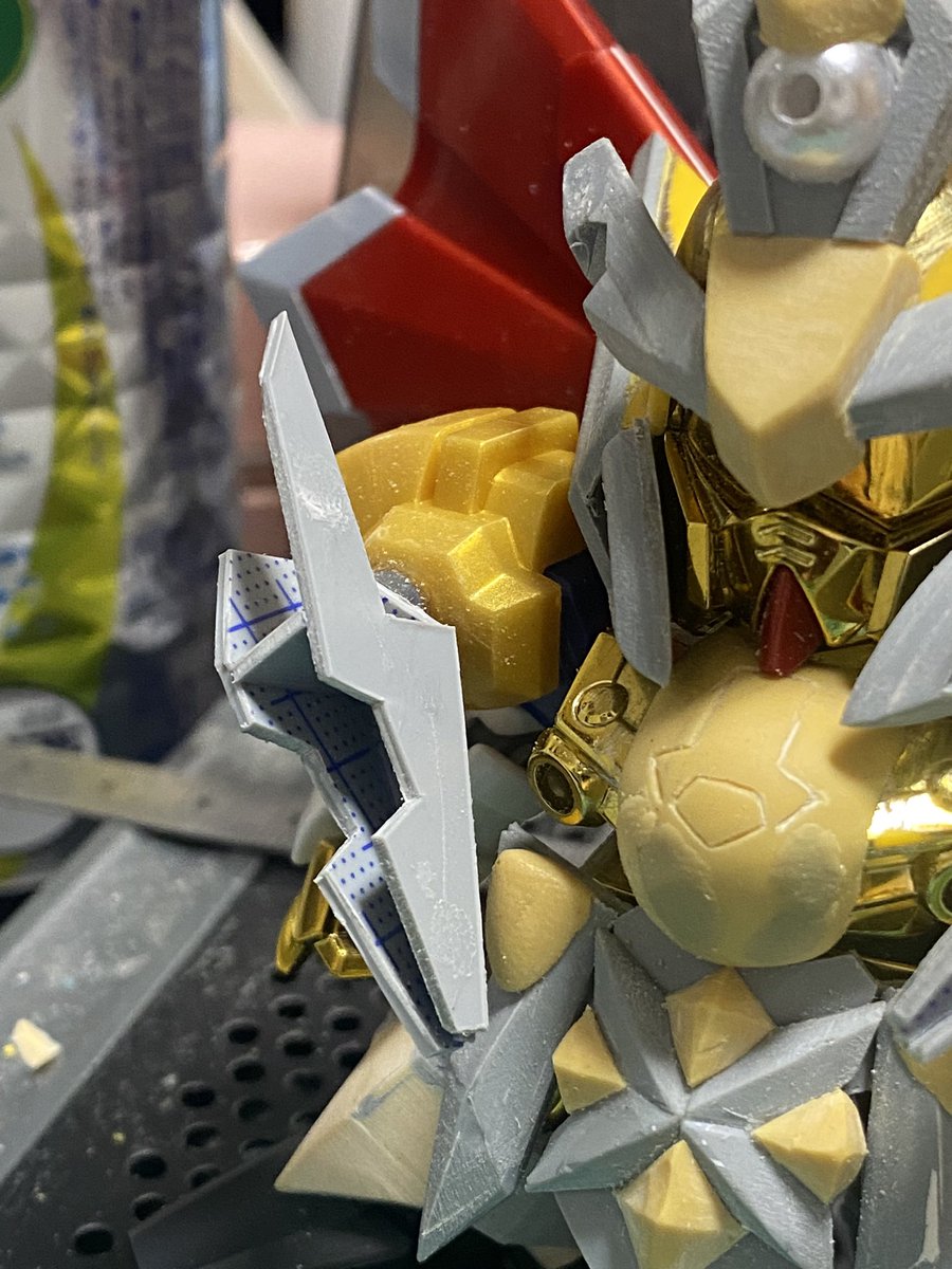 #俺SD作ってるぜ #ガンプラ #ガンプラ好きと繋がりたい #スペリオルドラゴン スペリオルドラゴンZ③ 腰の鎧を制作。 プラ板積層のパーツが多いんだけど、せっかちなので接着剤乾き切る前に加工してしまって、表面が荒くなってる。😓 粗でパーツを作っている状況だけど、良いペース。
