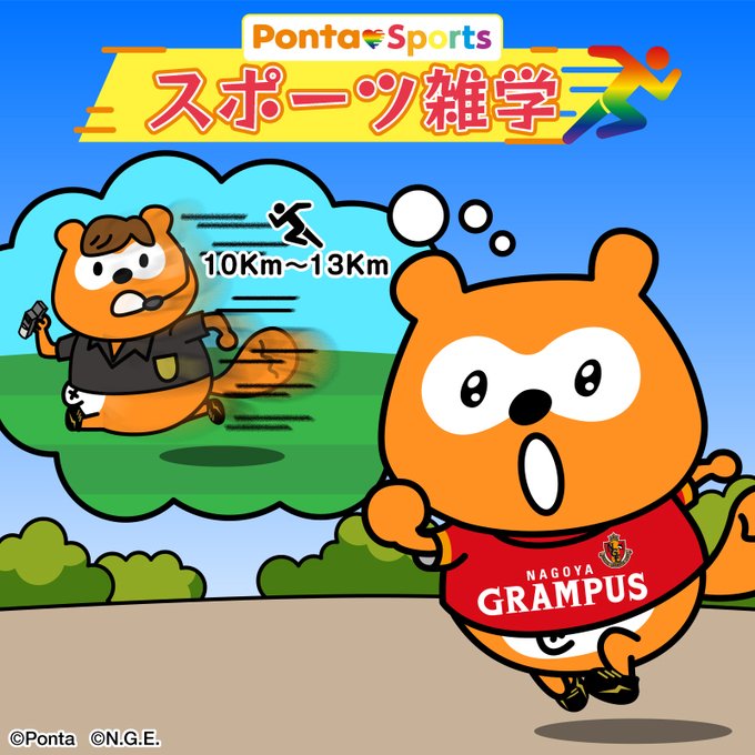 \Ponta♡Sports①/ 今日は #スポーツの日! そこでサッカーの雑学を紹介! 主審さんが1試合で走る距離は平均で10~13kmの距離になるんだとか!すごい! グラポン、感動して走り込みを始めました⚽💨💨💨💨💨💨💨 📢Pontaはスポーツを応援します! #PontalovesSports #グラポン