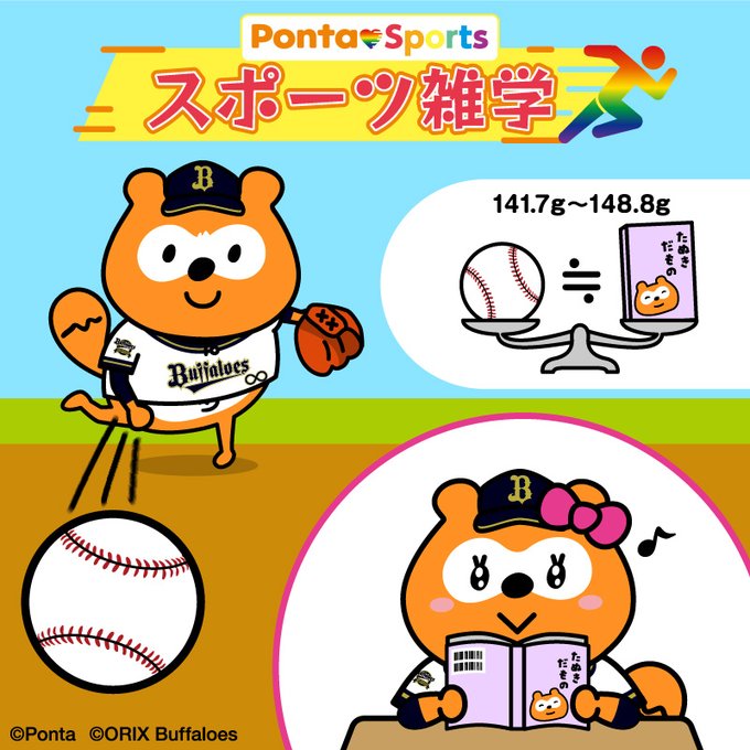 \Ponta♡Sports①/ 今日は #スポーツの日! そこで野球の雑学を紹介! 硬式ボールの重さは「141.7g~148.8g」と定められ、これは一般的な文庫本と同じ位の重さだそうです⚾📚 スポーツの秋、読書の秋…ポンタたちもそれぞれの秋を楽しんでいます✨ #PontalovesSports #バファポン