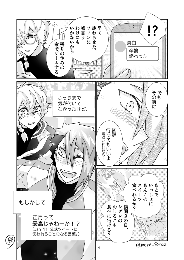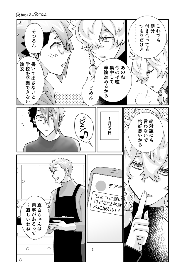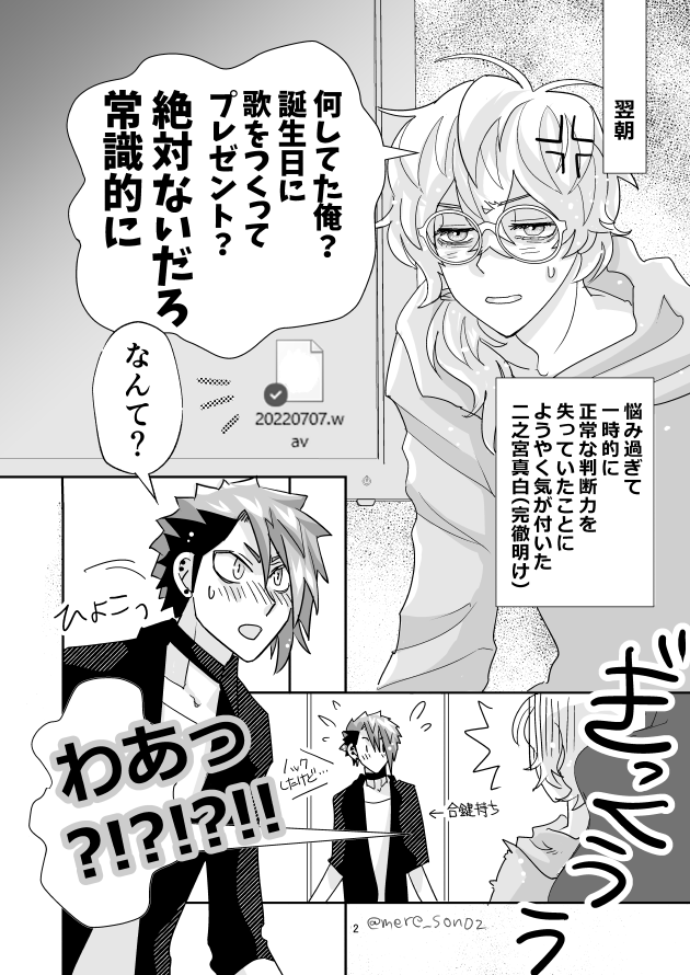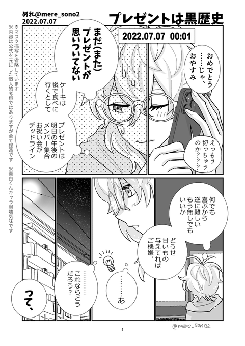 (2/2) 七奈也くんのお誕生日プレゼント選びを年々こじらせてきた真白くんとなにげにいつも相談に乗ってくれる凪くんの話 ※真白くんと七奈也くんがなぜか同居してます注意 ※他にもいろいろ捏造注意 #スマプロギャラリー #赤熊七奈也生誕祭2023 #赤熊七奈也誕生祭2023