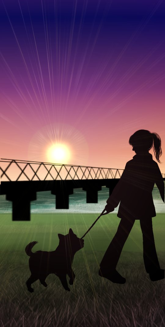 夜明けの散歩 河原には犬が似合う #デジタル #イラスト #アイビスペイント #スマホ指描き #背景使ってもいいのよ #リドローOK sketch.pixiv.net/items/18342185…