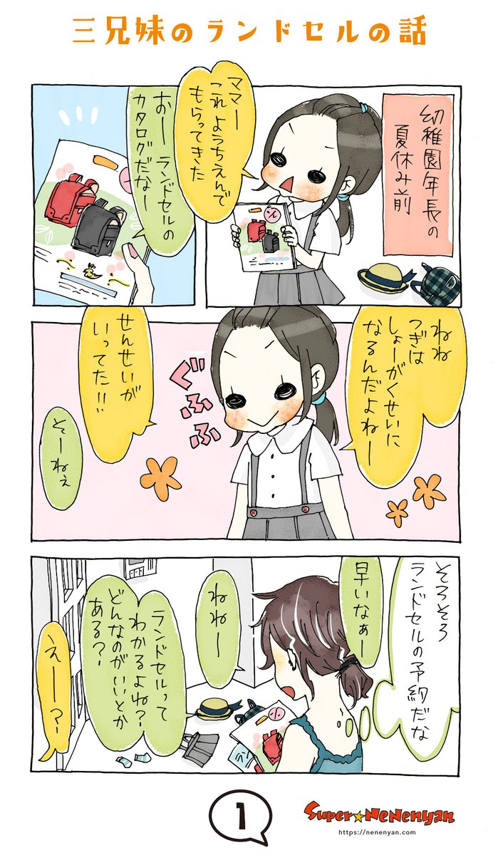 もうランドセル購入の時期なんですよ。今時はランドセルは新一年生になる前年度の夏休み前と言わずGWの前から…春に買うらしいです。 三兄妹のランドセルの話 nenenyan.com/supernenenyan_… #ランドセル #スーパーねねにゃん #育児漫画