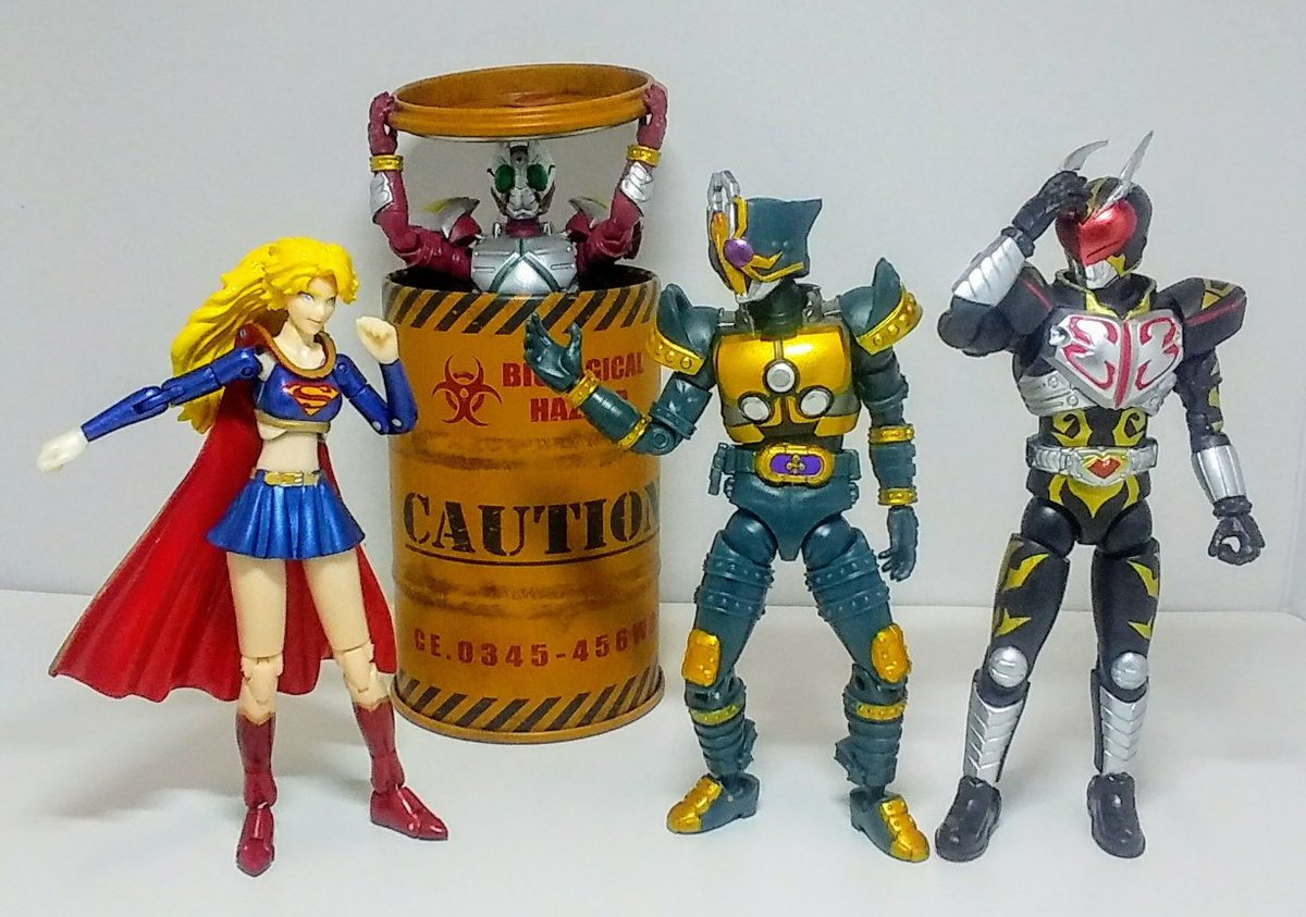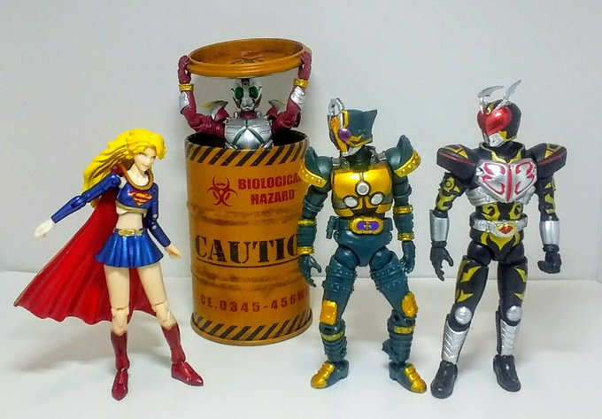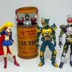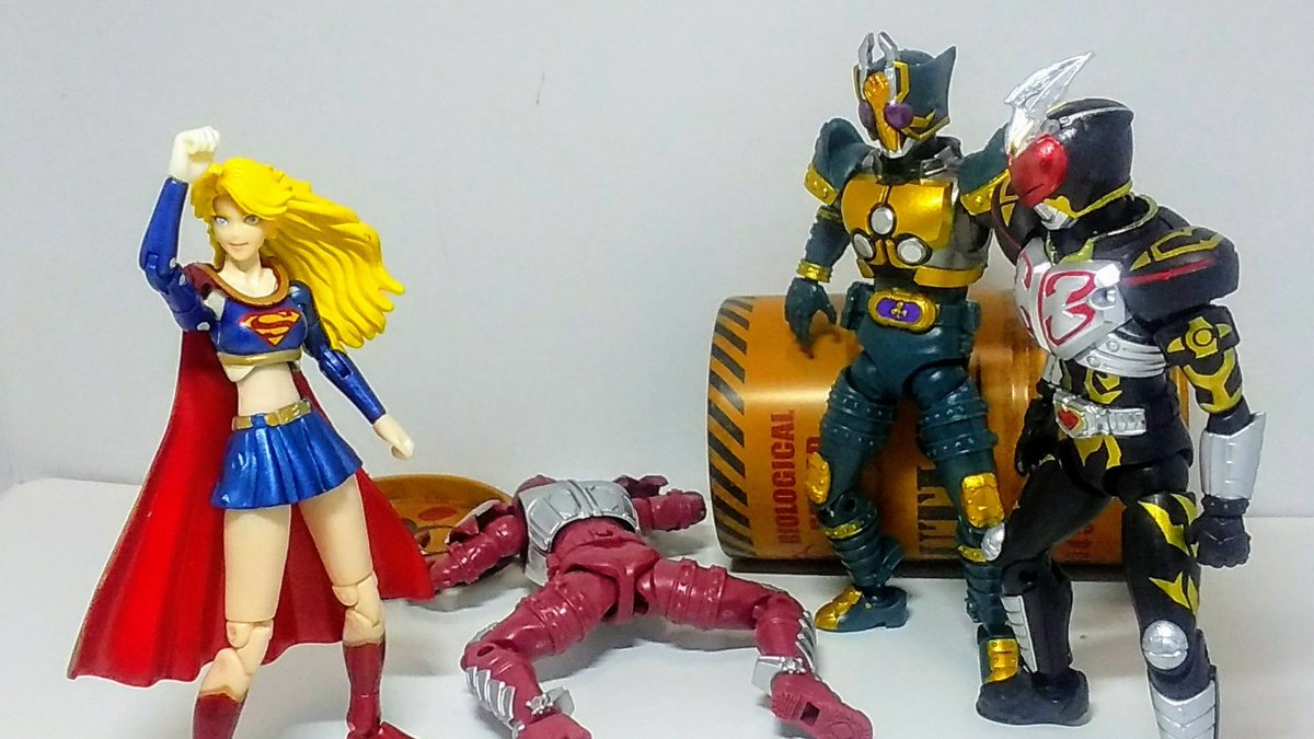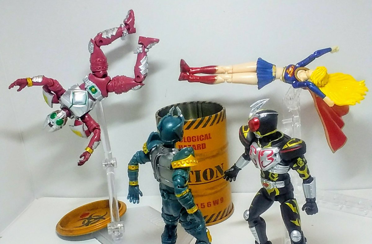 #夜のフィギュア撮影会 8/28「会話」遅刻 #おもちゃ撮影会 8/28「スーパー2」 #楽しく玩具撮影会 8/28「放置」 待て! え、何? 貴方、悪者ね! 思い込みでは? 何だとこの野郎!(ドガァ) ゲェーッ! 悪は滅びたわ! 貴重な橘さんが... #お笑いフィギュア劇場 #スーパーガール #仮面ライダー剣