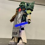 #スーパーロボコス大展 #コスメル @kaerubou_0108 はい。ウチの次男未完成展示です。 前掛けは次男からの依頼で私作です。(大和田秀樹先生の「隊長のザクさん」より参照) せっかくなので、親子並べてみました。