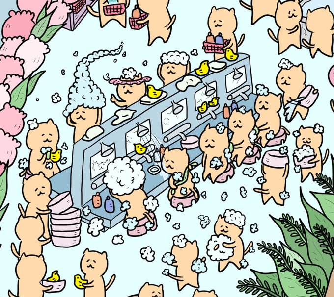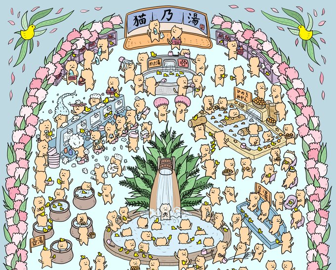 「猫乃湯」の入り口でしっかりかけ湯をする、マナーのある猫たちです👍 右下の方には鳥にもかけ湯をしている優しい猫もいます👍 #イラスト好きな人と繋がりたい #絵描きさんと繋がりたい #drawings #イラスト #digitalart #illustration #illusRT #スーパー銭湯 #お風呂 #温泉 #最強寒波 #寒さ対策
