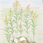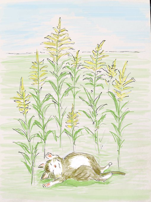【昼寝】セイタカアワダチソウがよく伸びてるね〜…あれ、猫だ🐱。昼寝してるのかな?日光浴かな?…どっちもにゃ〜byごろり猫🐱😊 #1コマ #イラスト #セイタカアワダチソウ #猫 #昼寝 #日光浴 #イラスト好きな人と繋がりたい #猫好きさんと繋がりたい #絵描きさんと繋がりたい #絵師さんと繋がりたい