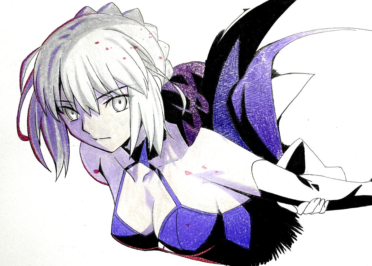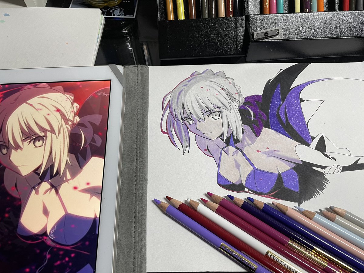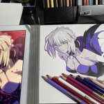 カリスマカラーを使って画用紙にセイバーオルタを描いてみた。 まぁ、ケント紙と違い 凹凸が多すぎてムラの凄い事… 諦めて寝ますww #イラスト #アナログイラスト #模写 #色鉛筆画 #FateGrandOrder #セイバー・オルタ #イラスト拡散 #フォロワーさんの推しを描きたい #フォロワーさん増やしたい