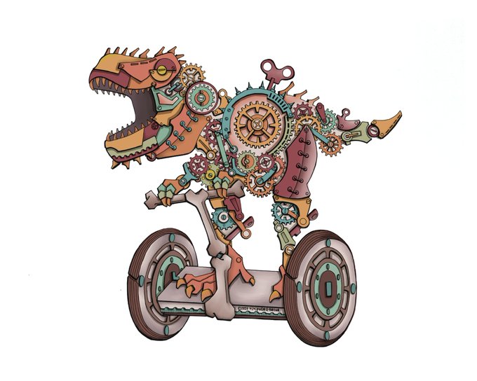 おはようございます(о´∀`о) 大雨にお気をつけてお過ごしください☔️ ⚙ティラノサウルス⚙ #スチームパンクイラスト #歯車イラスト #ペン画 #ティラノサウルス #セグウェイ #絵かきさんと繋がりたい