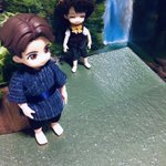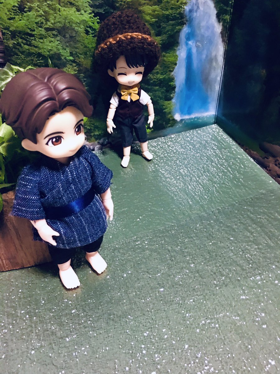 #深夜のねんどろ撮影60分一本勝負 6/30【すずしい】 #セリア のジオラマシート波やっと見つけたヨ😍清流の流れに裸足で入ってみたい。 万竹コンビ、涼しそう😉 高知編最終回記念😊 #朝ドラらんまん