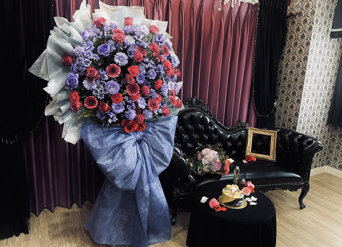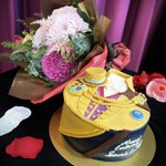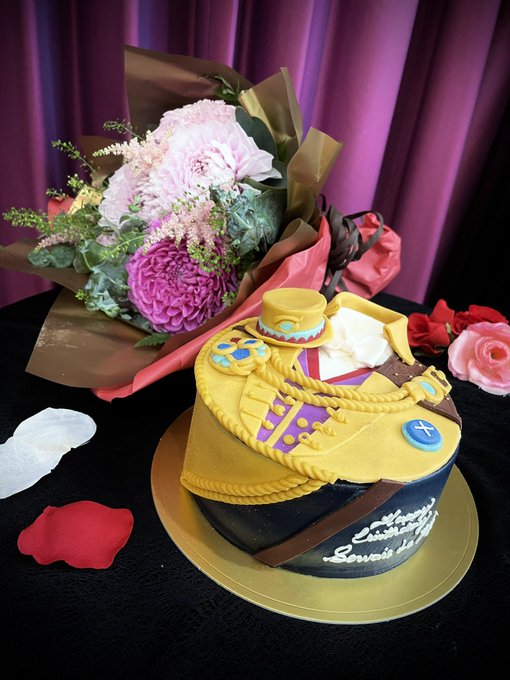 今年のセルヴェ誕は宝探しさんモチーフなケーキとお花モチーフが寸前に来たのでピンクと紫のダリアが入った花束にしました💐 誕生日おめでとう🎉 #セルヴェ・ル・ロイ誕生祭2022 #セルヴェ・ル・ロイ誕生日2022