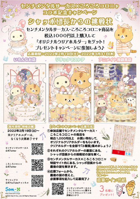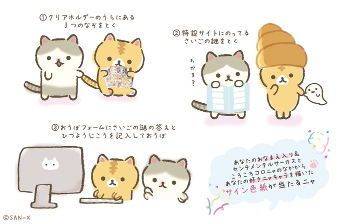 #センチメンタルサーカス × #ころころコロニャ こらぼキャンペーンのおしらせ🐱 コラボ特製クリアホルダーの裏面にある謎を解いて 直筆サイン色紙を当てよう🐰 san-x.co.jp/sentimental_co…