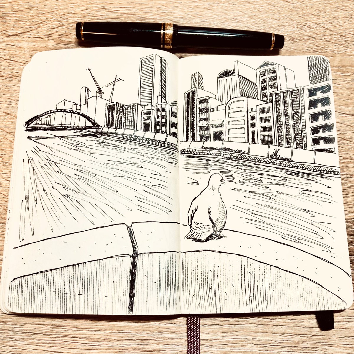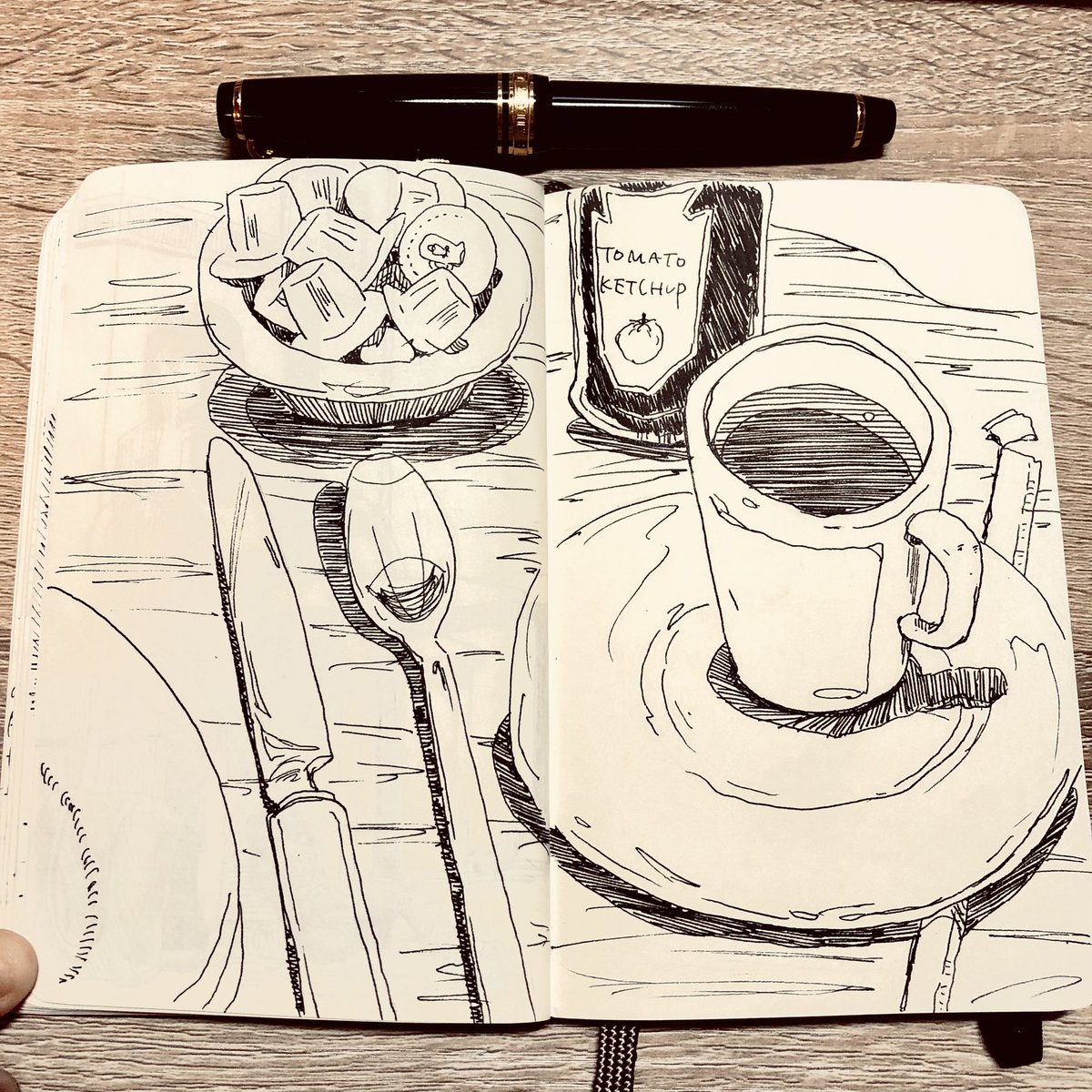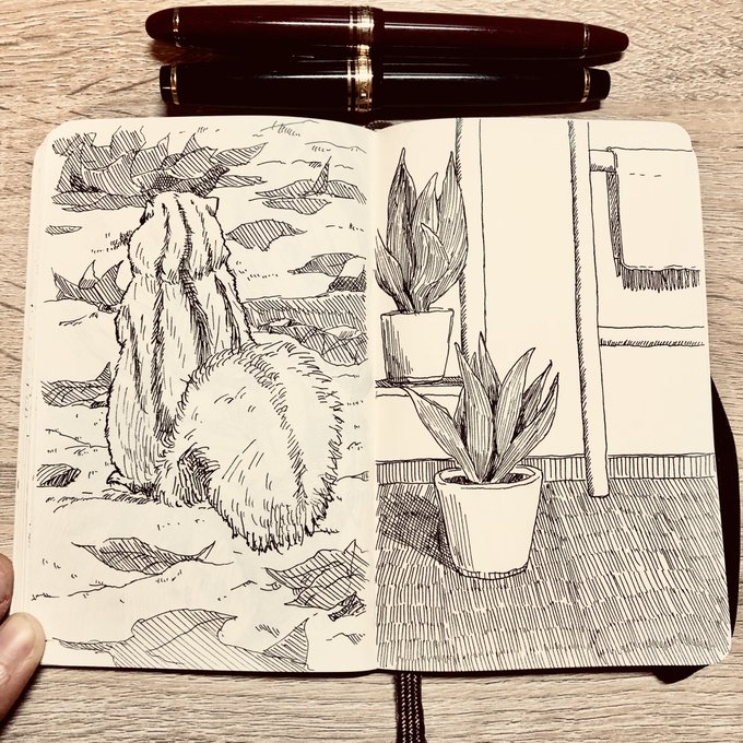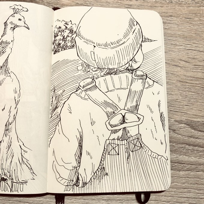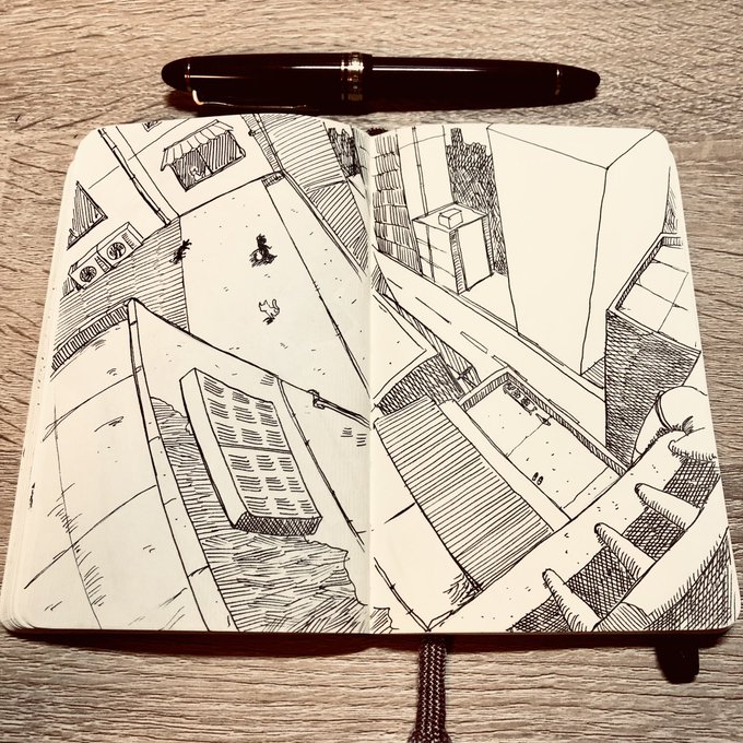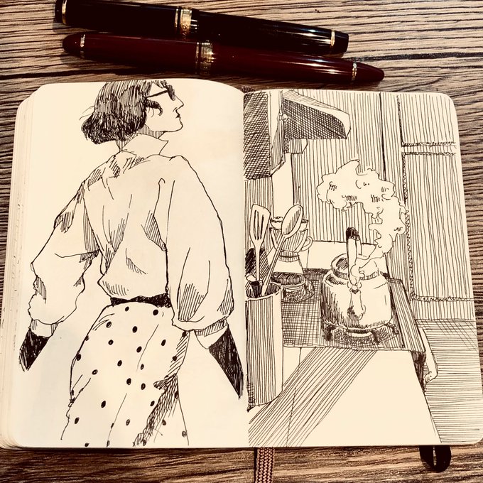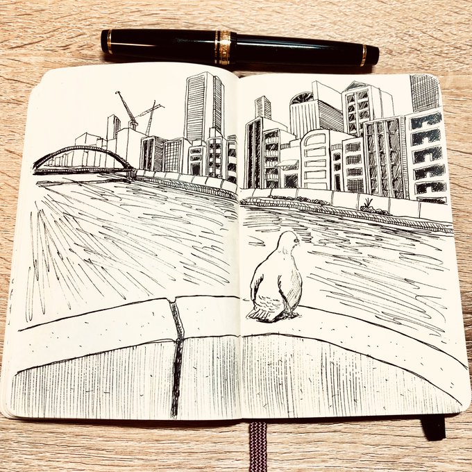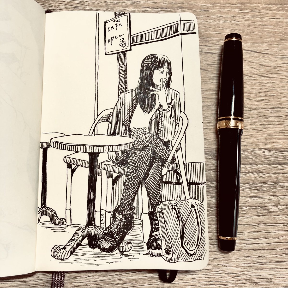 久々に文字入れた絵。 新しい万年筆のおかげで、線画の幅が広がった。 #万年筆 #セーラー万年筆 #モレスキン #moleskine #絵描きさんと繋がりたい #illustraion #イラスト #ペン画 #手帳 #アナログ画