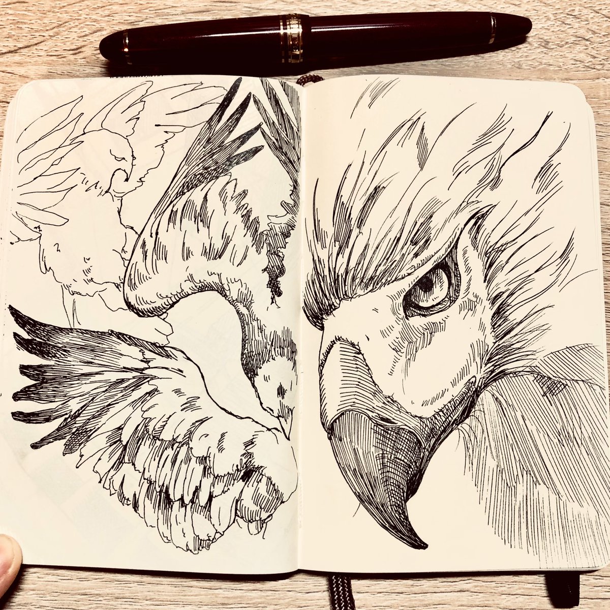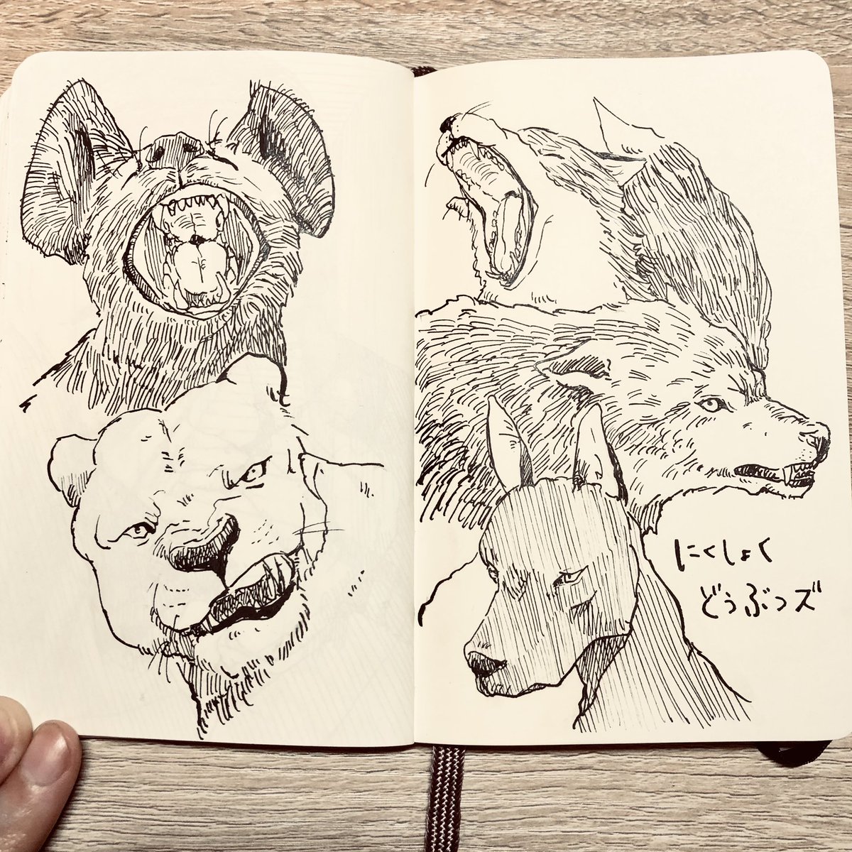 セーラーさんのふでDEまんねんで描く、肉食動物ズ。筆感が動物描くのに合う〜 #万年筆 #セーラー万年筆 #モレスキン #moleskine #絵描きさんと繋がりたい #illustraion #イラスト #ペン画 #手帳 #アナログ画