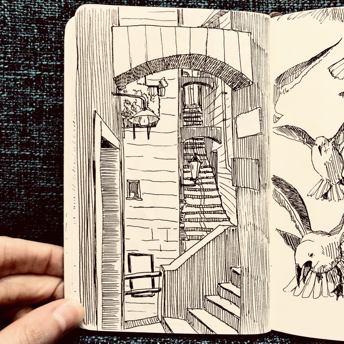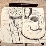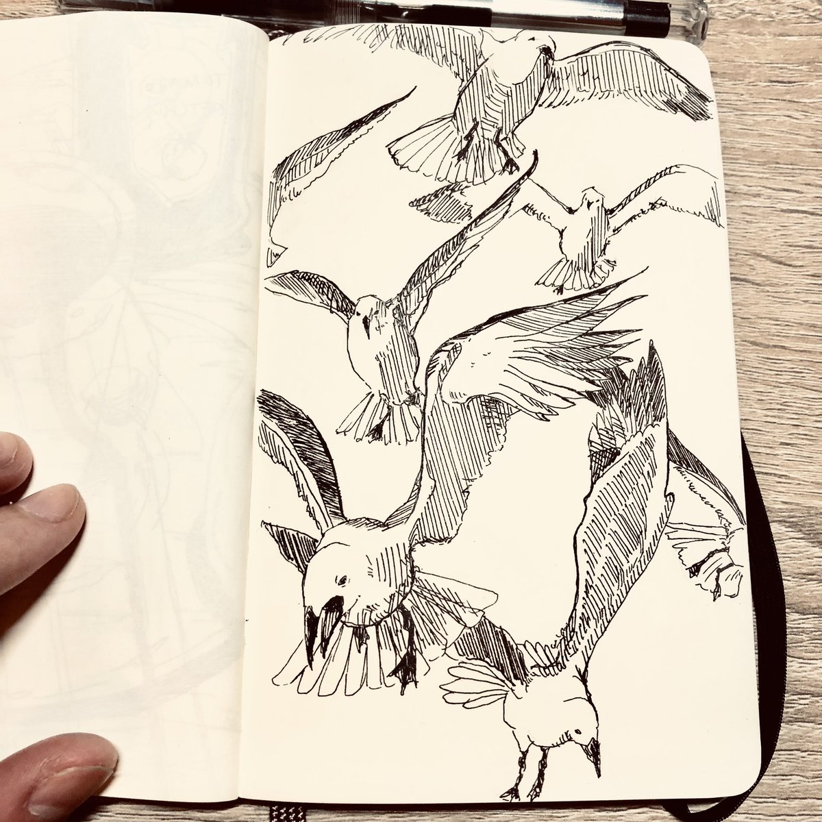 ミスったカフェと、カクノEFミリペン並みに細いな〜と思いながら描いたカモメ群。 カクノ以外でEF(国産の細さ)欲しい。おすすめあれば教えてください。 #万年筆 #セーラー万年筆 #モレスキン #moleskine #絵描きさんと繋がりたい #illustraion #イラスト #ペン画 #手帳 #アナログ画